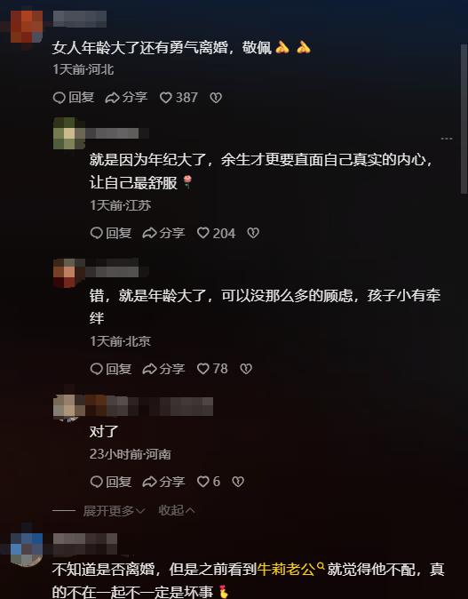 似乎也不太可能,这一点从牛莉的评论就可以看出,在宣布自己要离婚时,牛莉的脸上看不到什么哀伤、愤怒和失落的神情,反倒是有种能够远行的欣喜。