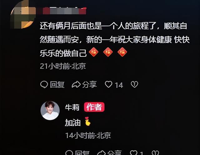 尤其是当某位网友也表示自己也会在两个月后进行一个人的旅程时,牛莉还专门回复了两个字: