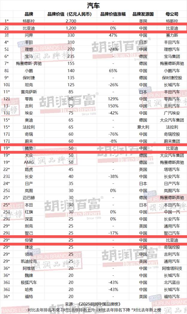 更惊喜的是,比亚迪旗下的腾势和仰望也首次上榜,腾势以50亿元、仰望以25亿元的品牌价值,成功跻身全球汽车行业品牌序列,咱们国产车真的越来越牛了!另外前十名里,特斯拉、丰田等5个非国产品牌占据席位,竞争依旧激烈~