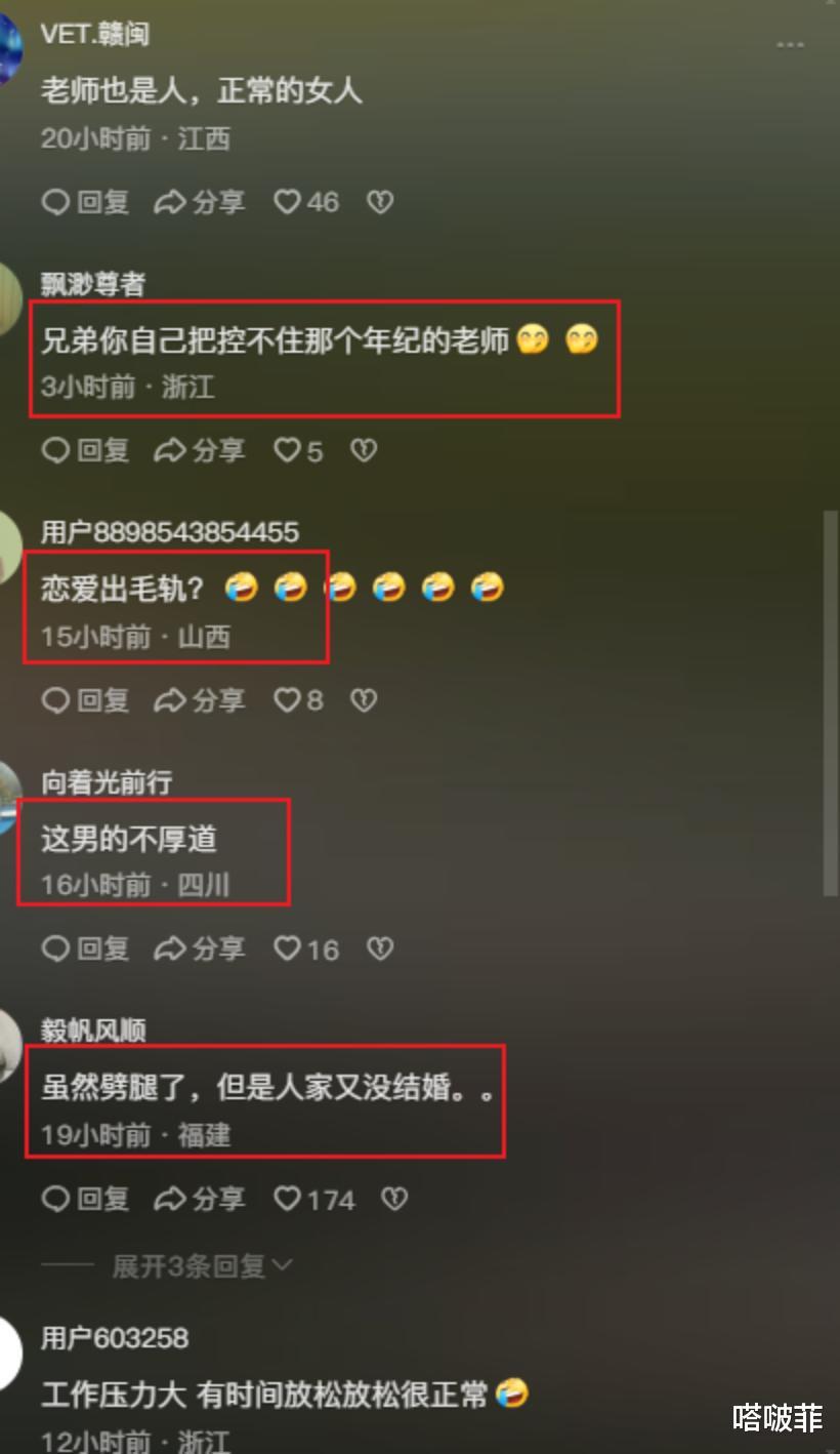 这件事情很快就在网络上传播开了,网友纷纷觉得男子的行为不厚道,毕业了就举报女教师,得不到就毁灭。甚至大家觉得两个人没有结婚,不能说出轨,最多是劈腿!