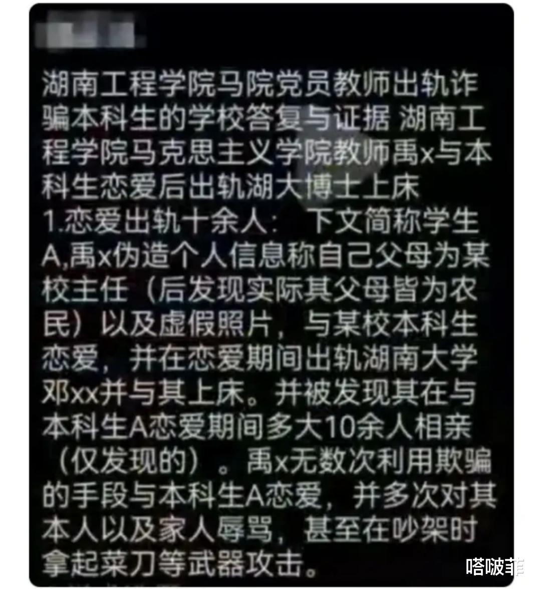 毕业生表示女教师在恋爱期间和十多个人相亲,并且上床了,其中男子爆料出轨对象是湖南大学的博士邓某。这一下子让男子接受不了,为何在恋爱期间还和他人有不正当关系以及行为,毕竟男人受不了绿帽子!