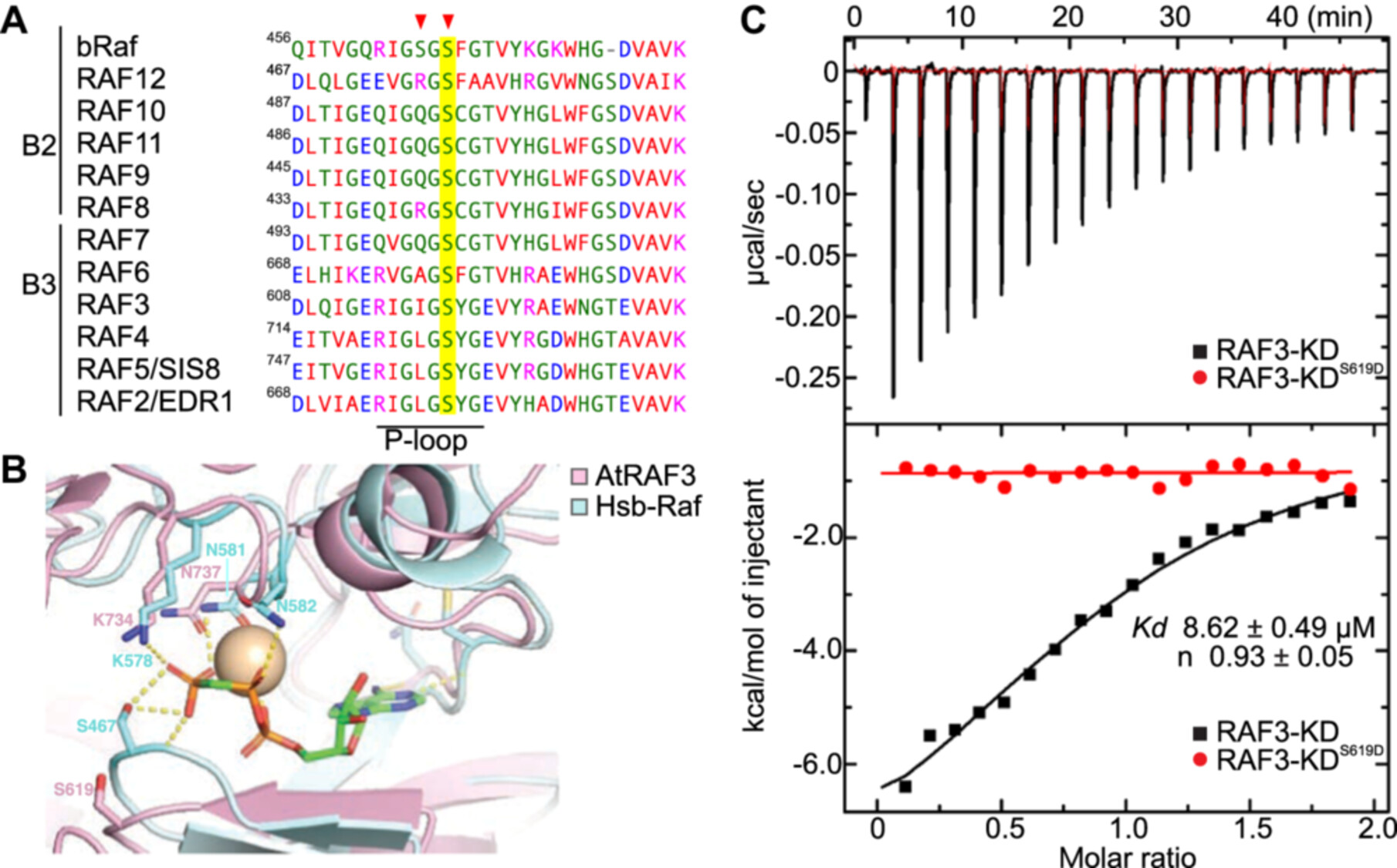 磷酸化 = 活性抑制:将 Ser619 突变为模拟磷酸化状态的天冬氨酸(S619D)后,RAF3 的 ATP 结合能力显著下降,体外自磷酸化活性与体内激活 SnRK2s 的能力均大幅降低;