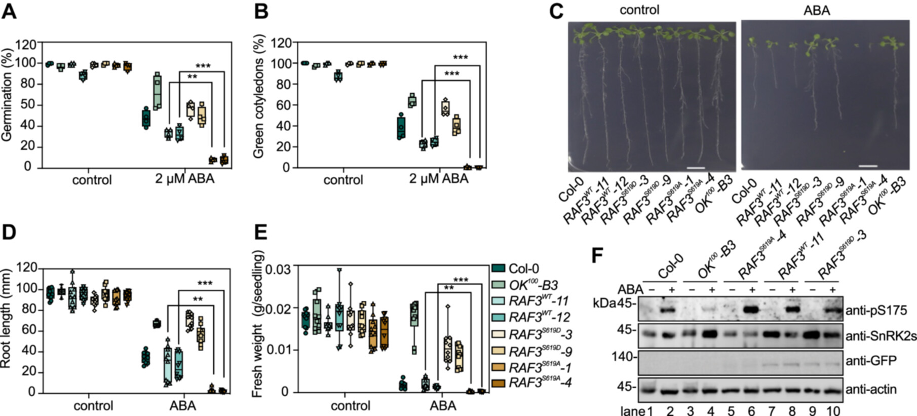 去磷酸化 = 活性激活:将 Ser619 突变为模拟去磷酸化状态的丙氨酸(S619A)后,RAF3 活性显著提升;携带该突变的 B3 亚组高阶突变体(OK100B3)对 ABA 敏感性增强,抗逆响应速度明显加快。
