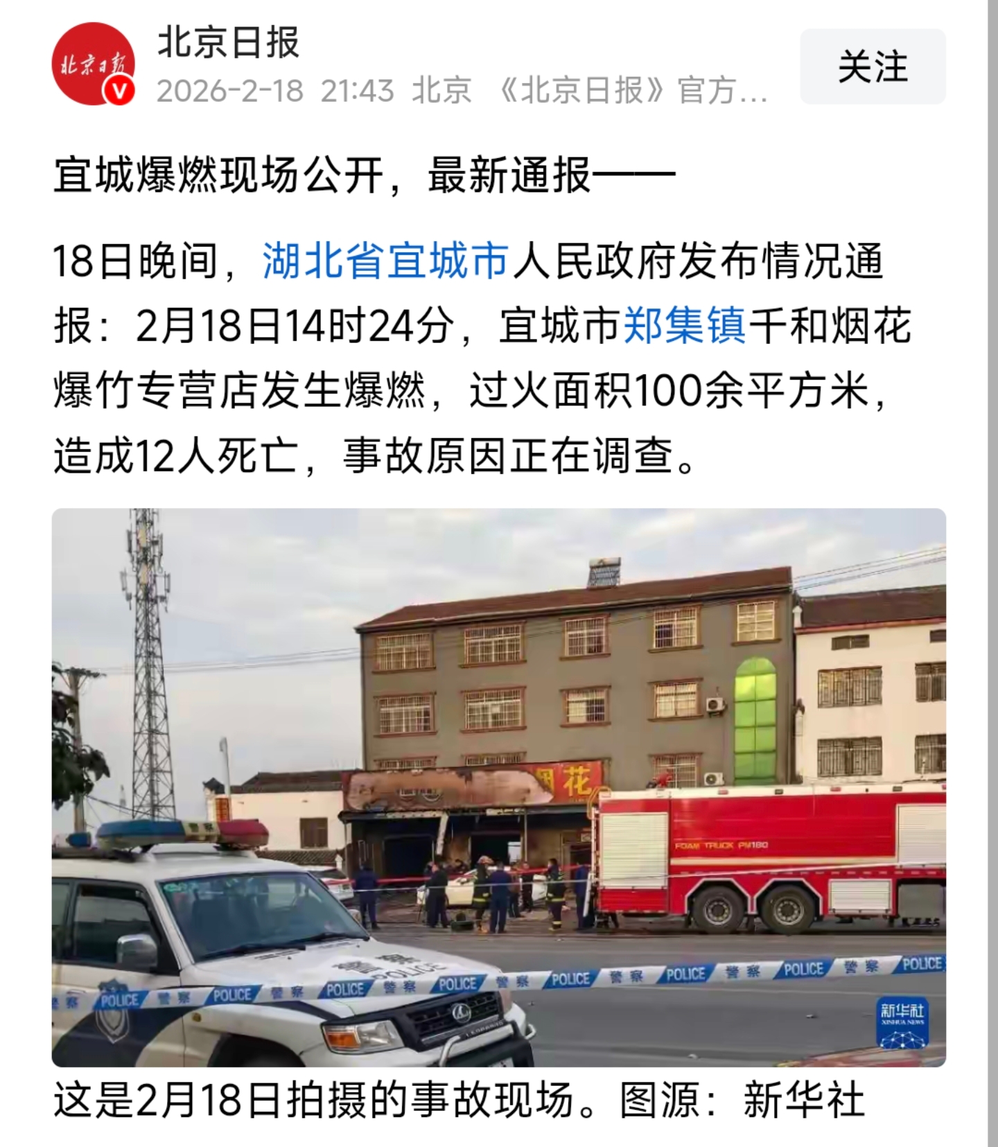 2月18日下午,湖北宜城郑集镇一家烟花爆竹专营店发生爆燃,过火面积100多平方米,造成12人死亡。这个消息一出来,真的让人心里一紧,大过年的,本来是热热闹闹的日子,却发生了这样的悲剧,太让人痛心了。