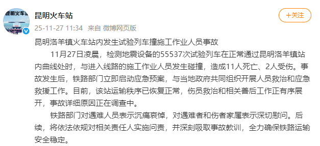 11月27日凌晨,检测地震设备的55537次试验列车在正常通过昆明洛羊镇站内曲线处时,与进入线路的施工作业人员发生碰撞,造成11人死亡、2人受伤。事故发生后,铁路部门立即启动应急预案,与当地政府共同组织开展人员救治和应急救援工作。目前,该站运输秩序已恢复正常,伤员救治和相关善后工作正有序展开,事故详细原因正在调查中。铁路部门对遇难人员表示沉痛哀悼,对遇难者和伤者家属表示深切慰问。后续,将依法依规对相关责任人实施问责,并深刻吸取事故教训,全力确保铁路运输安全稳定。(昆明火车站)