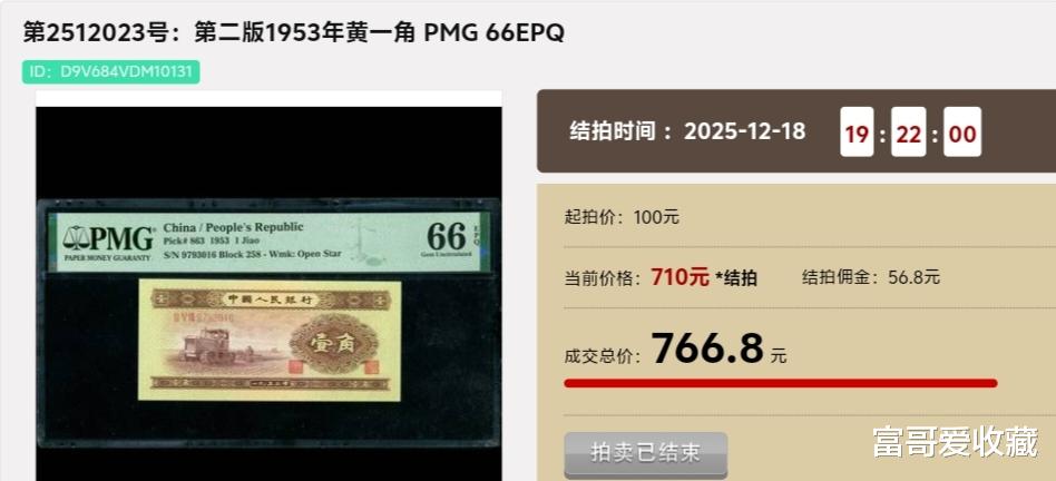 在2025年12月18日的“现代钱币拍卖会”中,一张PMG评级66分(带EPQ)的1953年“黄一角”,最后拍出了766.8元。足足提升了7600多倍!