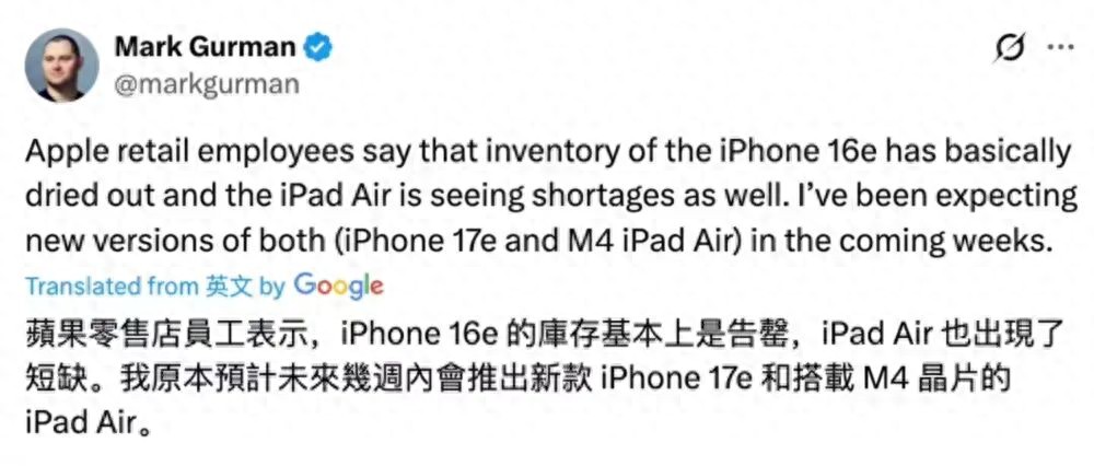 昨日,苹果知名爆料人马克·古尔曼发文称,据苹果零售渠道员工消息,iPhone 16e手机的库存基本已经告罄,现款iPad Air这边也出现了短缺现象。