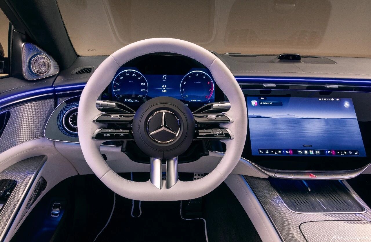 内饰方面:改款前倾斜45度的纵置中控屏被取消,取而代之的是类似EQS上的三屏设计,包括12.3英寸液晶仪表、14.3英寸中控屏+12.3英寸的副驾屏;全新的MB.OS操作系统融入了更智能的AI虚拟助手、沉浸式导航等功能;全新的方向盘虽然与现款“蜻蜓”方向盘造型类似,但经过重新设计已经回归了实体按钮和滚轮;此外可加热的安全带也是首次出现。