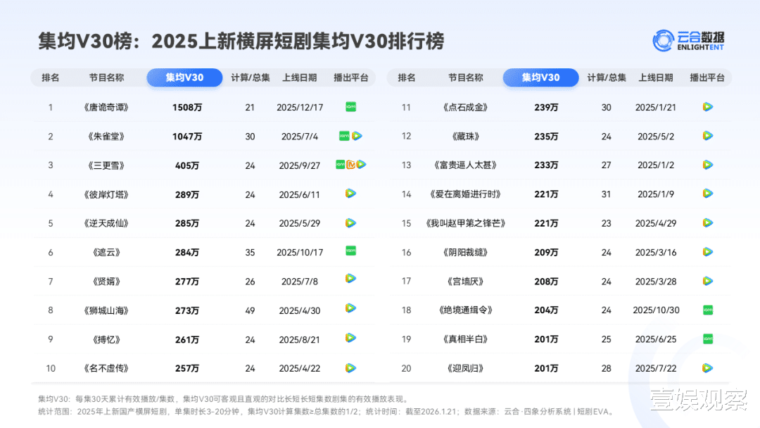 在具体项目上,根据云合数据显示,2025上新横屏短剧集均V30的前三名分别为《唐诡奇谭》《朱雀堂》《三更雪》,而前两部1508万和1047万的集均V30,也超过了2024年该榜单首位《大王别慌张》的623万。同时,《朱雀堂》还以4500万分账票房刷新了行业票房纪录。