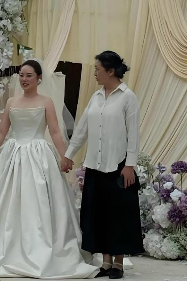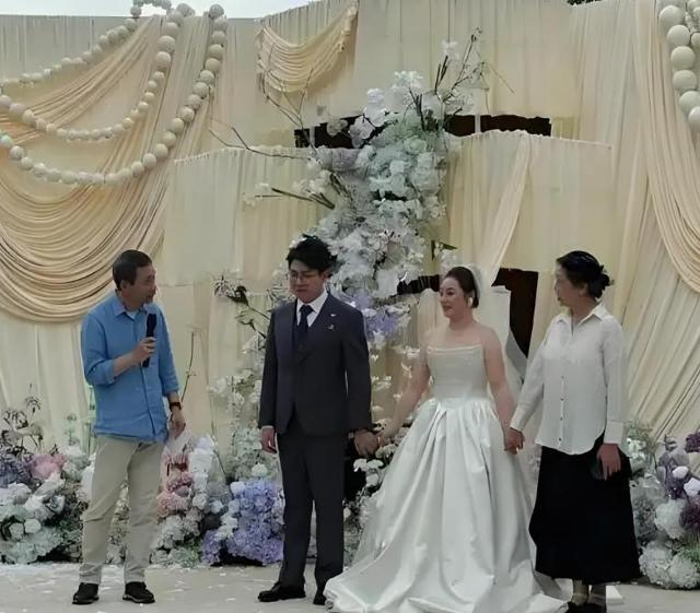 她的妻子江珊则站在新娘的身旁,满面笑容,江珊只给自己做了简单的妆容。