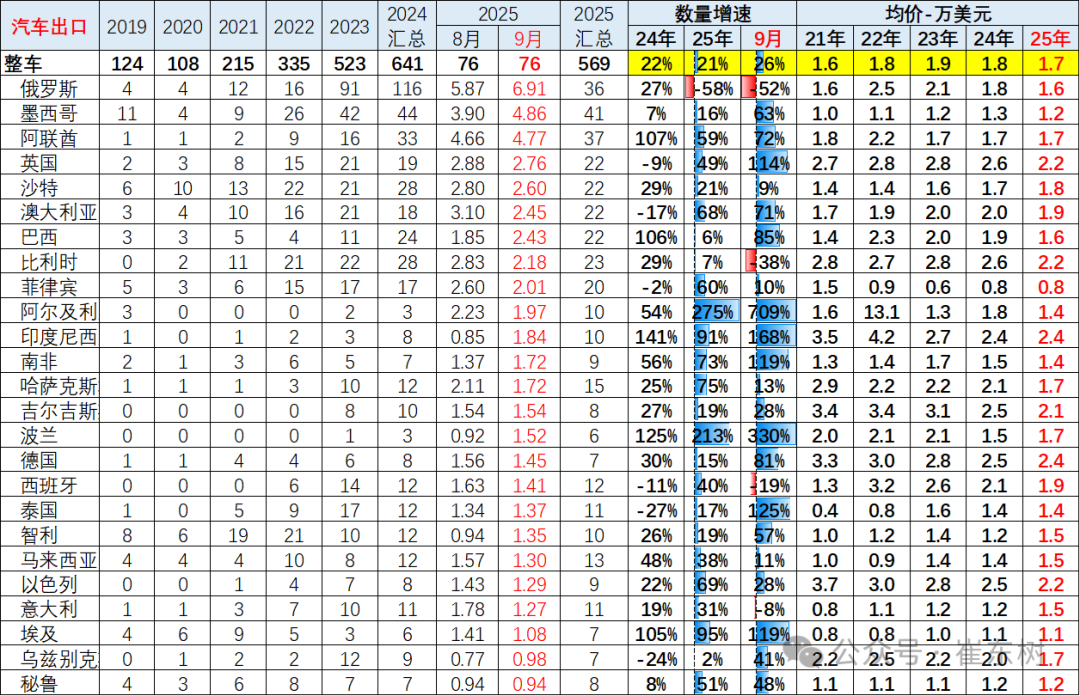 墨西哥以41.07万辆的成绩成为中国汽车出口第一大目的国,阿联酋以36.78万辆位居第二,俄罗斯以35.77万辆、同比下滑58%,排到了第三。俄罗斯市场出口量暴跌的同时,新兴市场以迅猛的增速异军突起:阿联酋同比增长59%至13.71万辆,澳大利亚同比增长68%至9.01万辆,菲律宾同比增长60%至7.37万辆,英国同比增长49%至7.36万辆,阿尔及利亚同比增长275%至7.35万辆。
