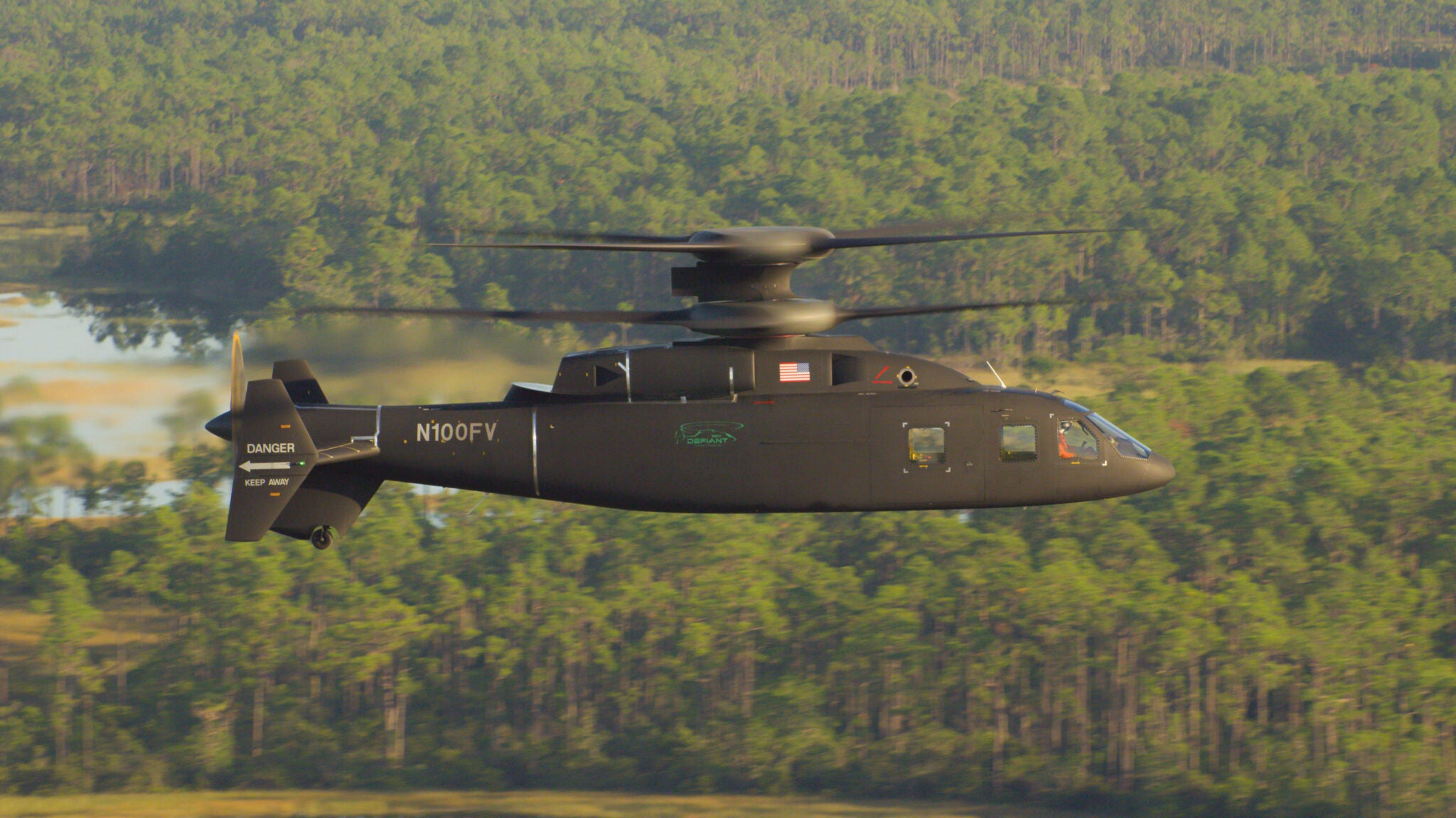 西科斯基SB-1无畏高速直升机,机长18.5米,高4.7米,旋翼直径17.25米,最大起飞重量约14.5吨,以两台T55-GA-714A涡轴发动机为动力,最大平飞速度463公里每小时/250节,巡航速度380公里每小时/205节,最大航程789公里或者说424海里,内部载荷1.8吨,外部吊挂5.4吨。