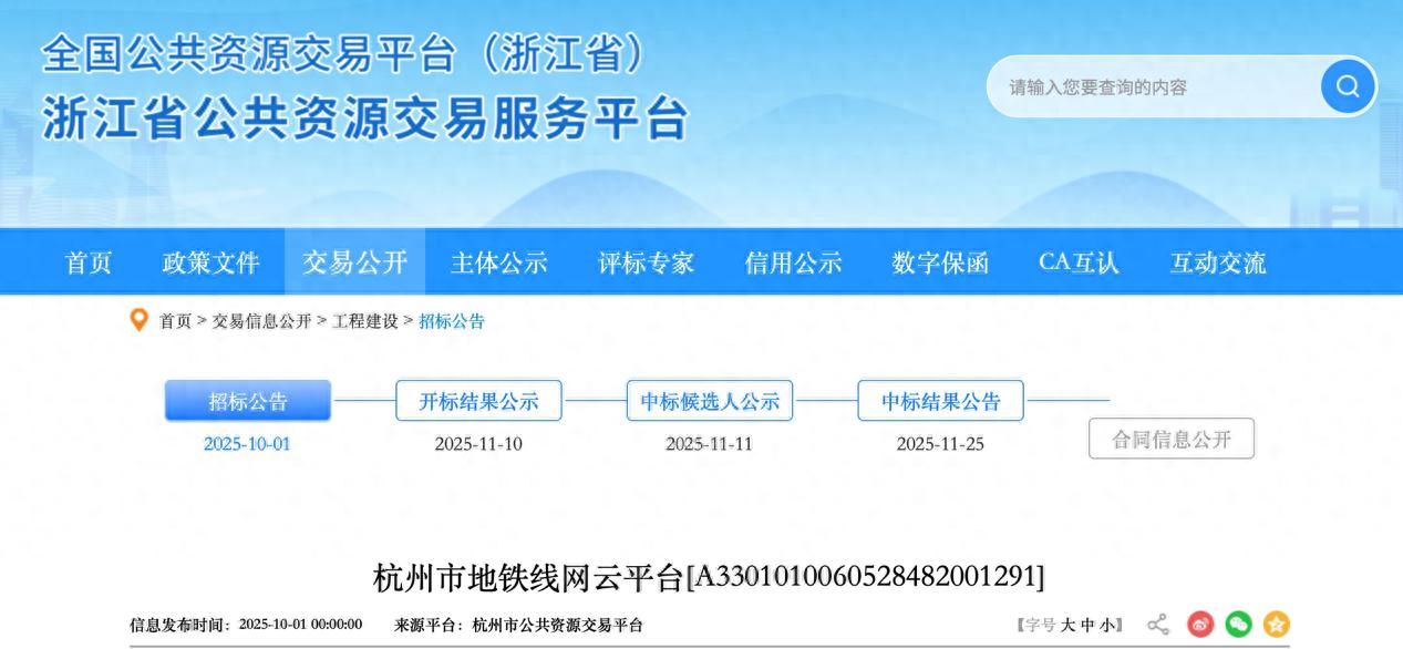 前期招标公告显示,杭州市地铁线网云平台项目招标人为杭州市地铁集团有限责任公司,项目工程概算2.15亿元,招标范围内工程造价2亿元,建设地点位于杭州,交货期为供货指令发出日起不超过90天。