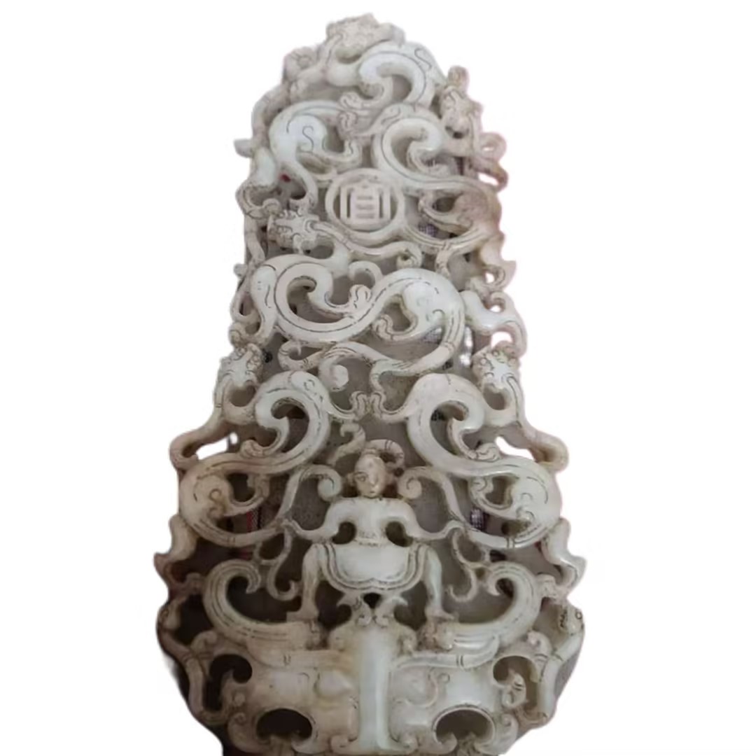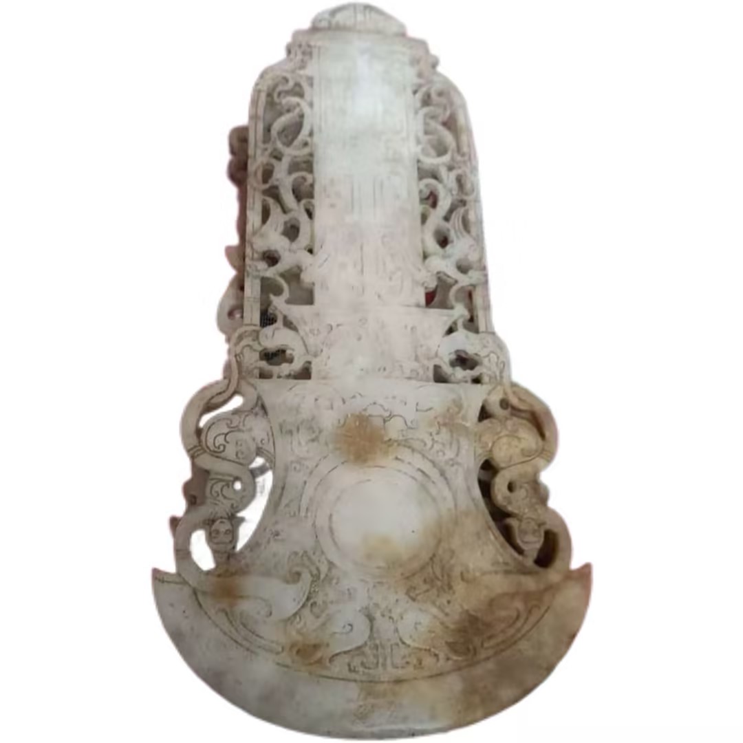 (一)稀缺性:镂空古玉的 “幸存者偏差”在远古玉器中,镂空工艺的玉器本就稀少 —— 镂空增加了制作难度,也提高了损坏率,能完整流传至今的更是凤毛麟角。这件长 30 厘米、镂空完整、纹样清晰的玉斧,在古玉收藏市场中属于 **“孤品级”** 藏品,其稀缺性直接推高了收藏价值。