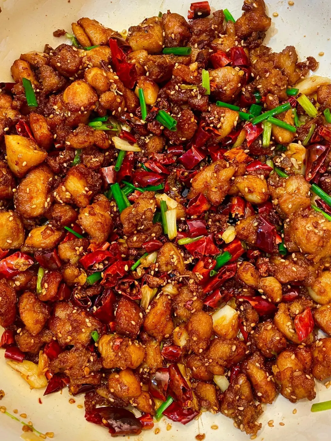 出锅装盘:加入白芝麻翻炒均匀,立即出锅装入深盘,辣椒需将鸡肉完全覆盖
