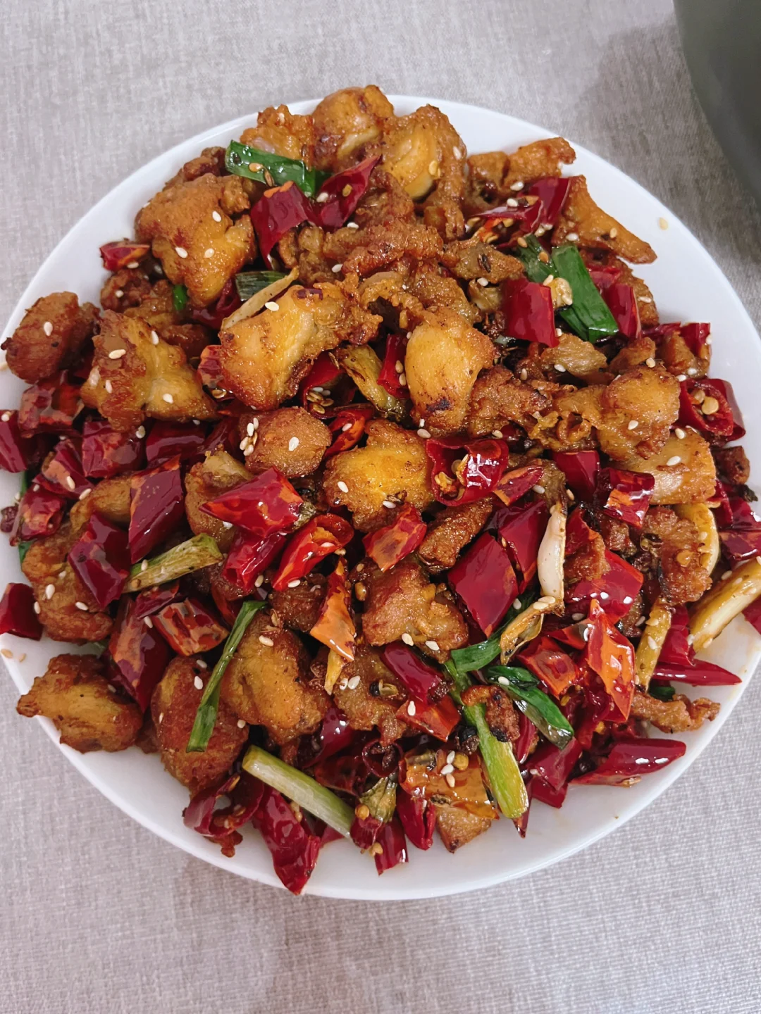 观其形:成品红亮诱人,大量辣椒与花椒堆成 “小山”,鸡肉块隐藏其中,点缀着金黄的白芝麻,宛如一幅热烈的川渝风情画,视觉冲击力极强。