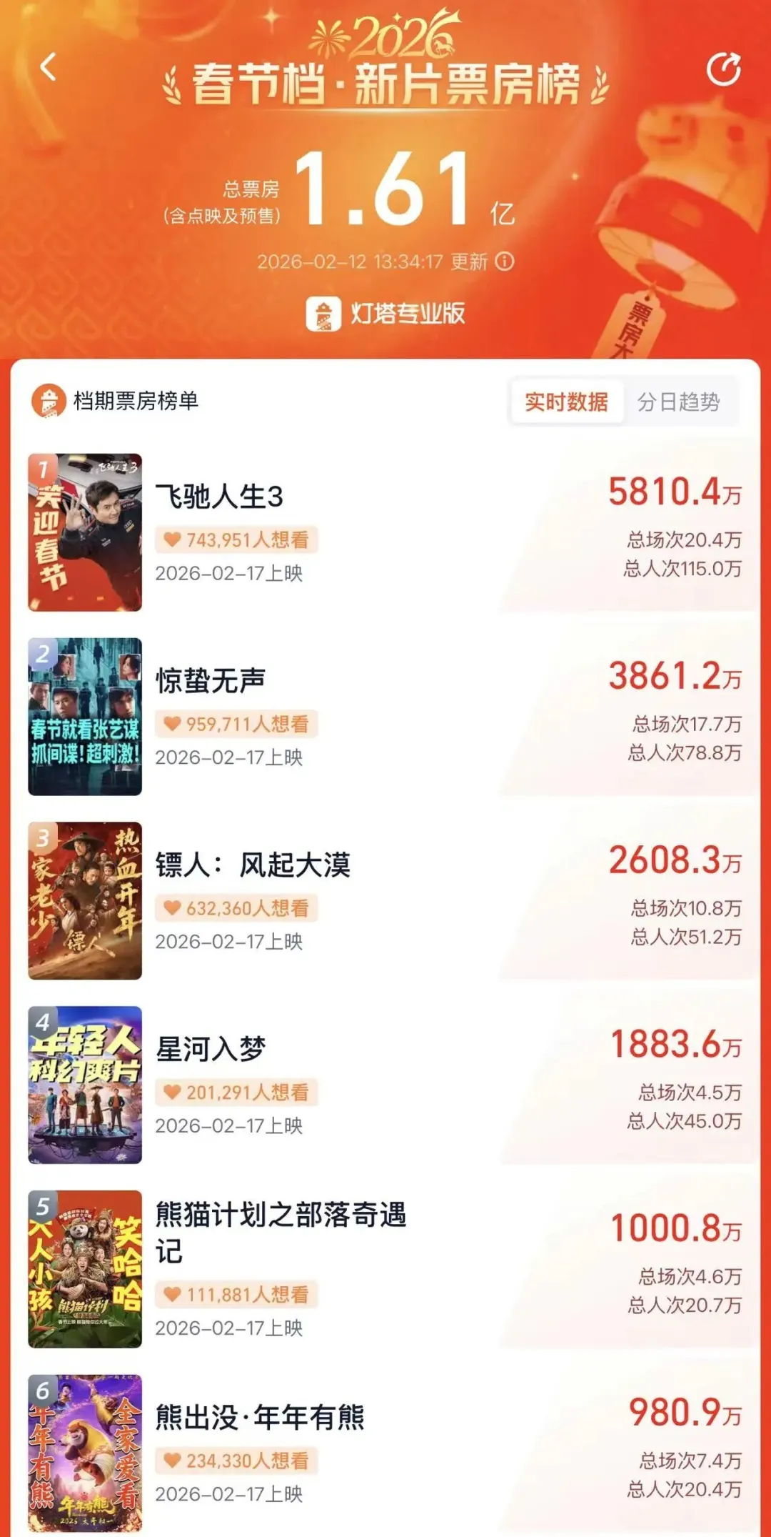 2026年春节档自2月9日10:00开启预售,截至2月12日13:30,袁和平执导,吴京、谢霆锋、于适、陈丽君主演的武侠