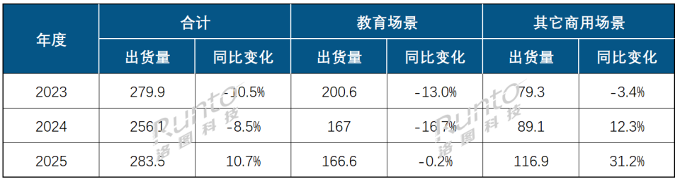 从细分应用场景出货来看,2025年全球教育交互平板出货量为166.6万台,同比下降0.2%;商用交互平板出货量为116.9万台,同比增长31.2%。