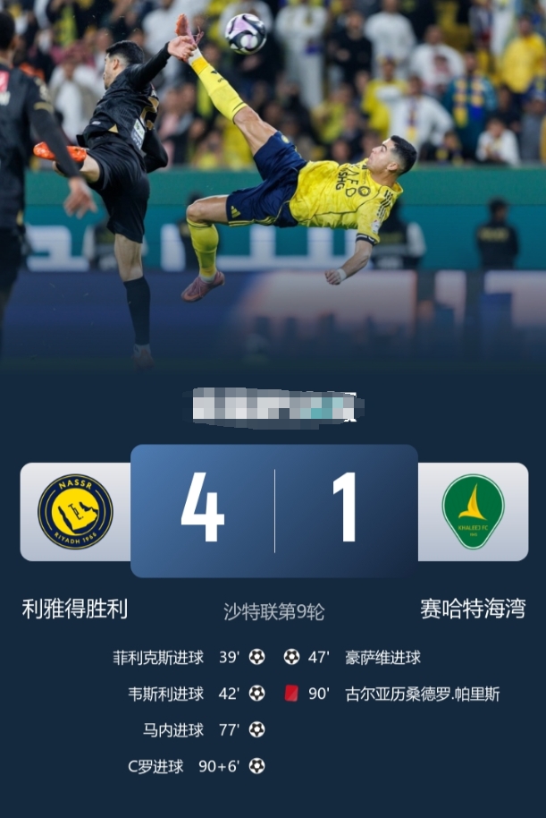 北京时间11月24日01:30,沙特联第9轮利雅得胜利迎战赛哈特海湾的比赛,上半场C罗抽射造险,安吉洛助攻菲利克斯推射首开记录,随后菲利克斯助攻韦斯利远射扩大比分,下半场豪萨维世界波扳回一城,C罗失良机,马内兜射扩大比分,帕里斯直红被罚下,C罗补时精彩倒钩破门,最终利雅得胜利4-1赛哈特海湾,胜利开局9连胜4分领跑。