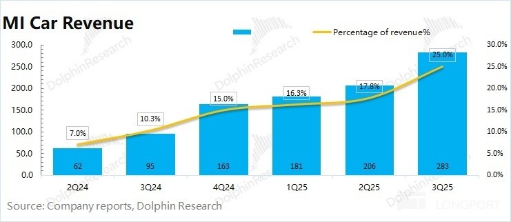 近期,小米发布第三季度财报:集团当期总营收1131亿元,同比增长22.3%;经调整净利润达113亿元,同比增长81%,创历史新高。其中,小米汽车业务实现扭亏为盈,由第二季度亏损3亿元,转为盈利7亿元(智能电动汽车及AI等创新业务合计)。本季度汽车业务收入达290亿元(创历史新高),汽车业务毛利率提升至25.5%,单车均价进一步提升至26万元。