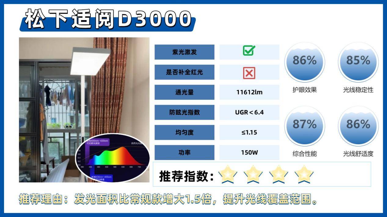 护眼大路灯第七名:松下适阅3000;具备11600lm的光通量,实际光线明亮覆盖面积宽广。