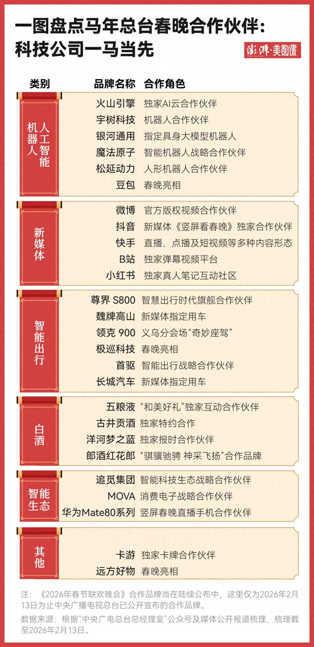 根据澎湃美数课工作室的不完全统计,截至2月13日,中央广播电视总台《2026年春节联欢晚会》(以下简称总台春晚)已官宣的合作伙伴达到了27家,既有传统消费企业,也有互联网大厂。近年来,总台春晚的合作赛道愈加丰富,从电商到视频弹幕,从笔记互动社区到AI云等诸多类目。