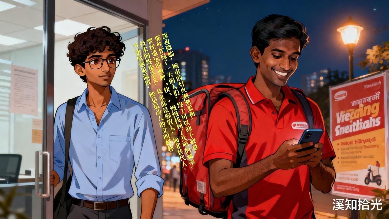 那个配送员送完最后一单,在回去的路上收到平台推送的明日培训通知,“英语沟通技巧,自愿参加,计入晋升积分。