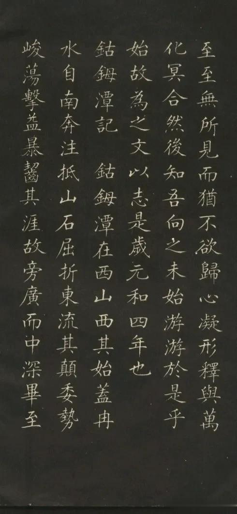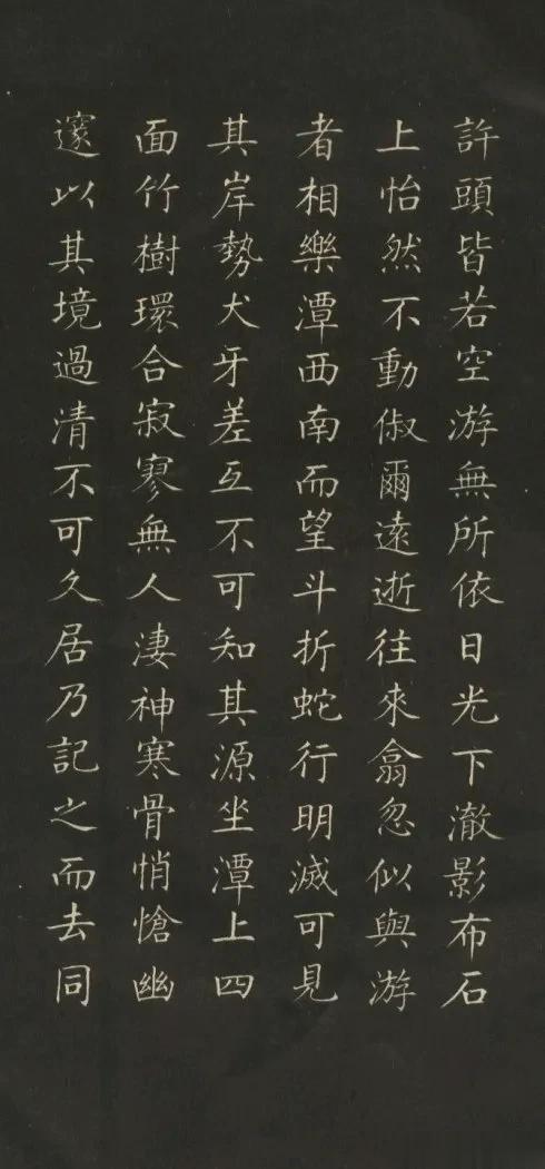 此作小楷取法晋唐,笔锋清劲如湘竹瘦挺,结构端稳却藏灵秀:“潭”字三点水牵丝轻绕,恰似溪流转折;“山”字撇捺舒展,暗合丘壑淡远。墨色沉润如烟雨,笔速随文势缓急——写“凄神寒骨”时,笔画敛紧如潭水凝寂;书“悠然而虚”处,线条舒展似丘间风轻。