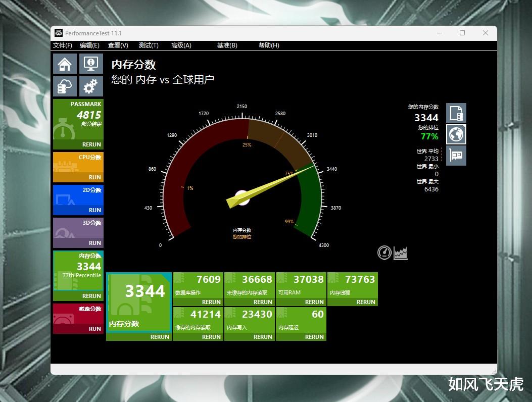 Performance Test内存测试总分3344分,排名77%。