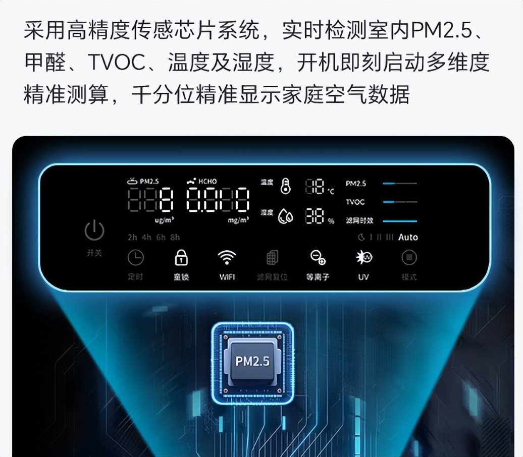 实测监测维度清晰,精准覆盖有娃家庭核心需求:甲醛(精度0.001mg/m³)、PM2.5(精度±1μg/m³)、TVOC、温度、湿度,五大数值同步显示在机身顶部LED屏,字体大小适中,老人、宝妈远距离也能清晰读取,彻底告别传统空净“优、良、差”的模糊提示。