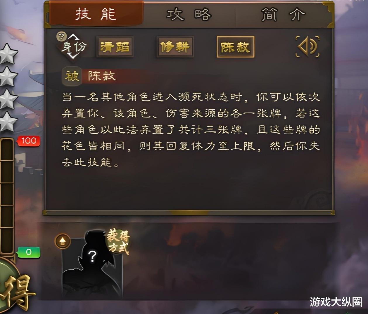 在危急的时刻,【势国渊】的【陈赦】相当于是给队友的“复活甲”,可以救人一命。对应的是当时田银、苏伯造反失败,数千跟随造反的人兵败后请求投降。国渊认为跟随造反的人不属于首恶,向曹操求情,使得这一千余人都得以保命。