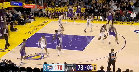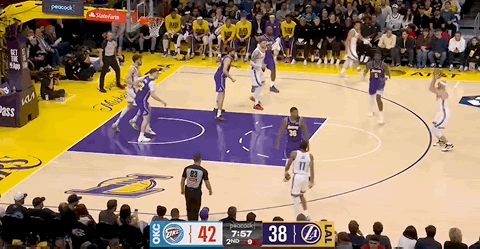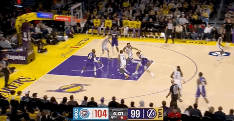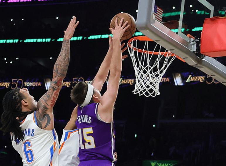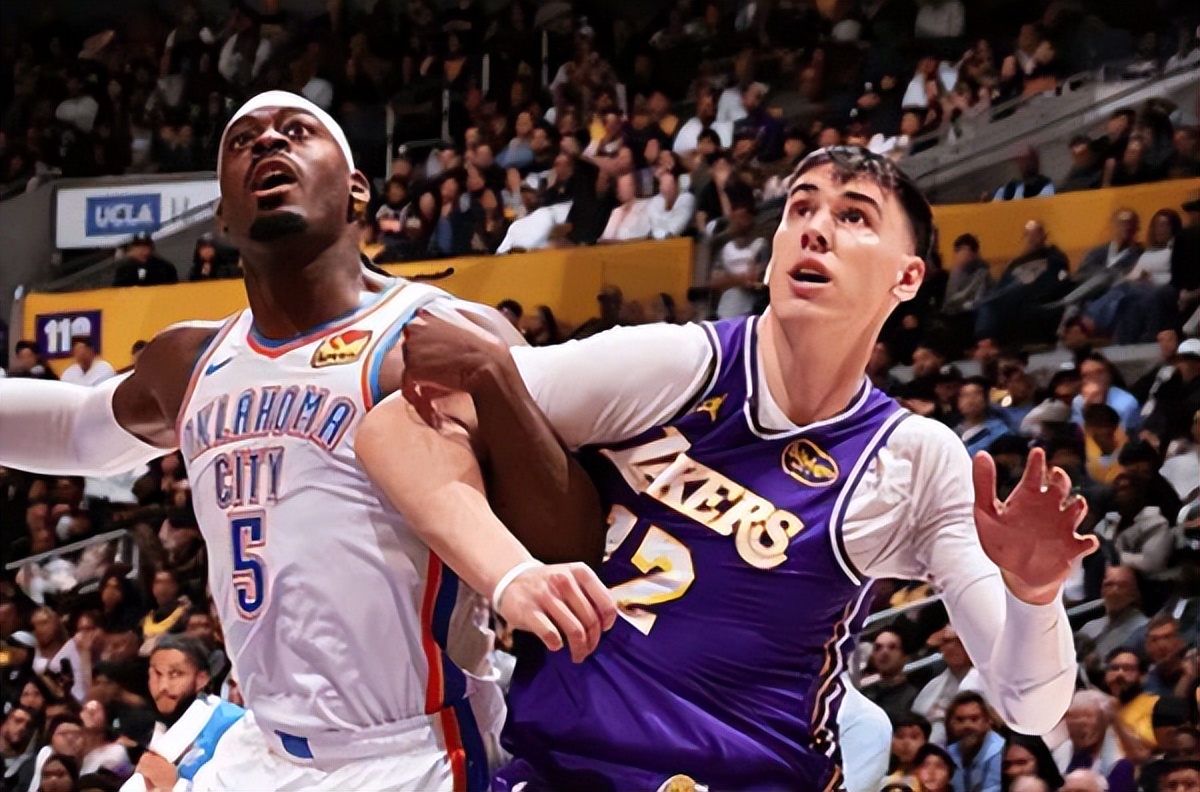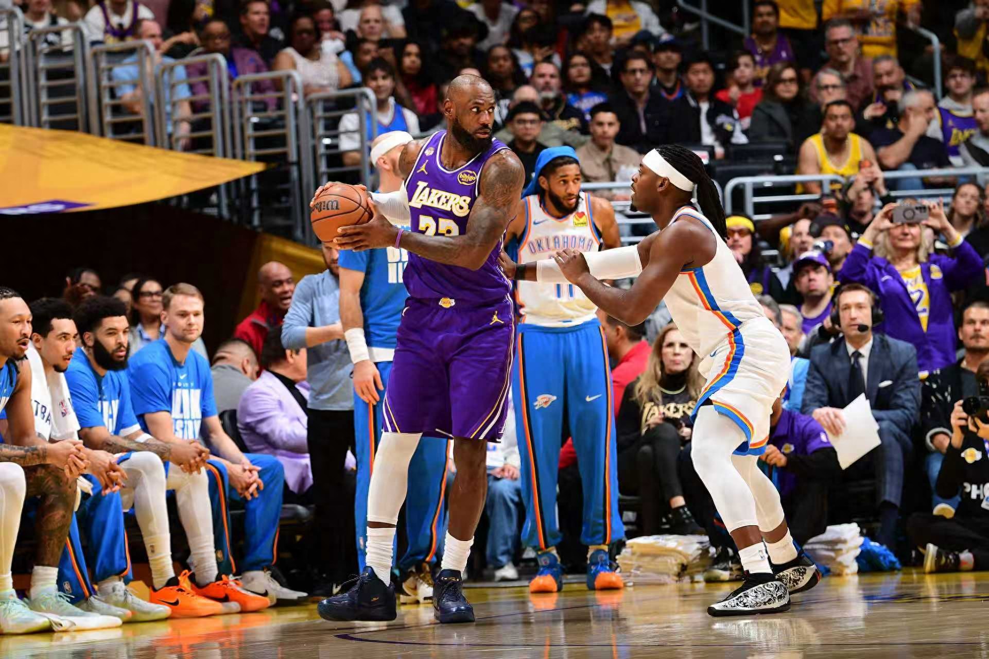 第四节湖人的低潮在最后6分钟,当时比分是100-99。对面戴格诺特将首发换上,湖人则是詹李带艾顿+斯马特+拉拉维亚的首发,在经过半节的厮斗后这套阵容同样无法匹配雷霆的强度。