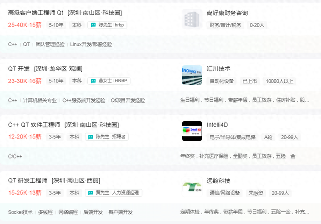 以下是boss直聘上Qt开发工程师的招聘信息,薪资待遇也是比较可观的,有一定工作经验的Qt开发工程师更是可以达到15薪40K的水平,这在整个IT行业来讲都不低了,如果能进入一个大厂的话,薪资待遇还能更上一层楼。