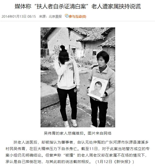 在2013年12月31日,广东河源铲车工吴伟青,好心扶起摔倒的老人,却被对方家属讹诈20万。因无监控、无证人,吴伟青百口莫辩,于2014年1月2日跳河自杀,用生命证明清白。后续警方调查确认,吴伟青的摩托车距离老人80厘米,根本不可能撞到对方,老人最终承认自己摔倒,就是想讹点钱,自己本心不坏,是因为对方不坚强……