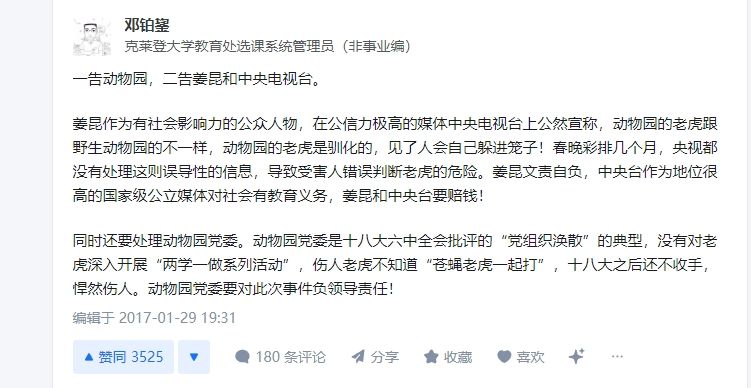 尤其是2017年春晚上,姜昆在《新虎口遐想》中的一句:“现在老虎都是人工驯化的,不咬人”这句话还真有信的,结果在春节期间,浙江、湖北等地接二连三出现人违规靠近老虎被咬身亡的事件。这么大的事情,春晚好歹表个态吧?偏偏没有!