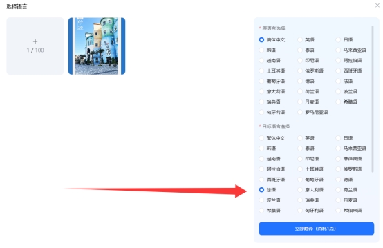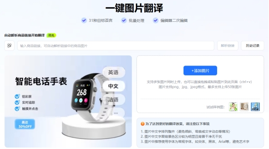 易可图是一款面向图片处理和电商场景的在线工具,其中的图片翻译功能,可以直接识别图片中的文字并翻译成目标语言,目前已支持31种目标语言,其中就包含法语。