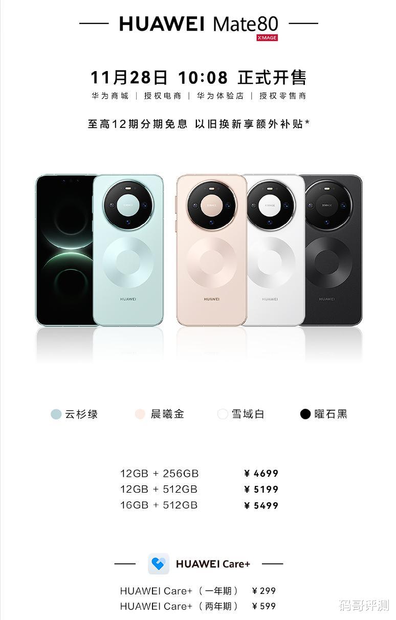 价格层面的诚意更是引爆市场的关键。在内存涨价、高端旗舰普遍提价的行业背景下,华为Mate 80系列逆势降价 800 元,4699 元的起售价较上两代大幅下探,堪称 “史上最香 Mate”。更具吸引力的是多重福利叠加:1200 元鸿蒙有礼权益、至高 1000 元日日新签到红包、300 元以旧换新补贴,三者叠加直接优惠 2500 元;再加上 12 期分期免息和部分地区 500 元国补,相当于不到 2000 元就能入手高端 Mate 新品,这样的性价比让消费者直呼 “诚意拉满”。目前华为Mate 80系列全版本均在华为商城、授权电商及线下体验店持续开售,其中Mate 80(12GB+256GB)4699 元版本成为入门首选,Mate 80 Pro(12GB+256GB)5999 元版本兼顾性能与体验,适合追求全方位升级的用户。