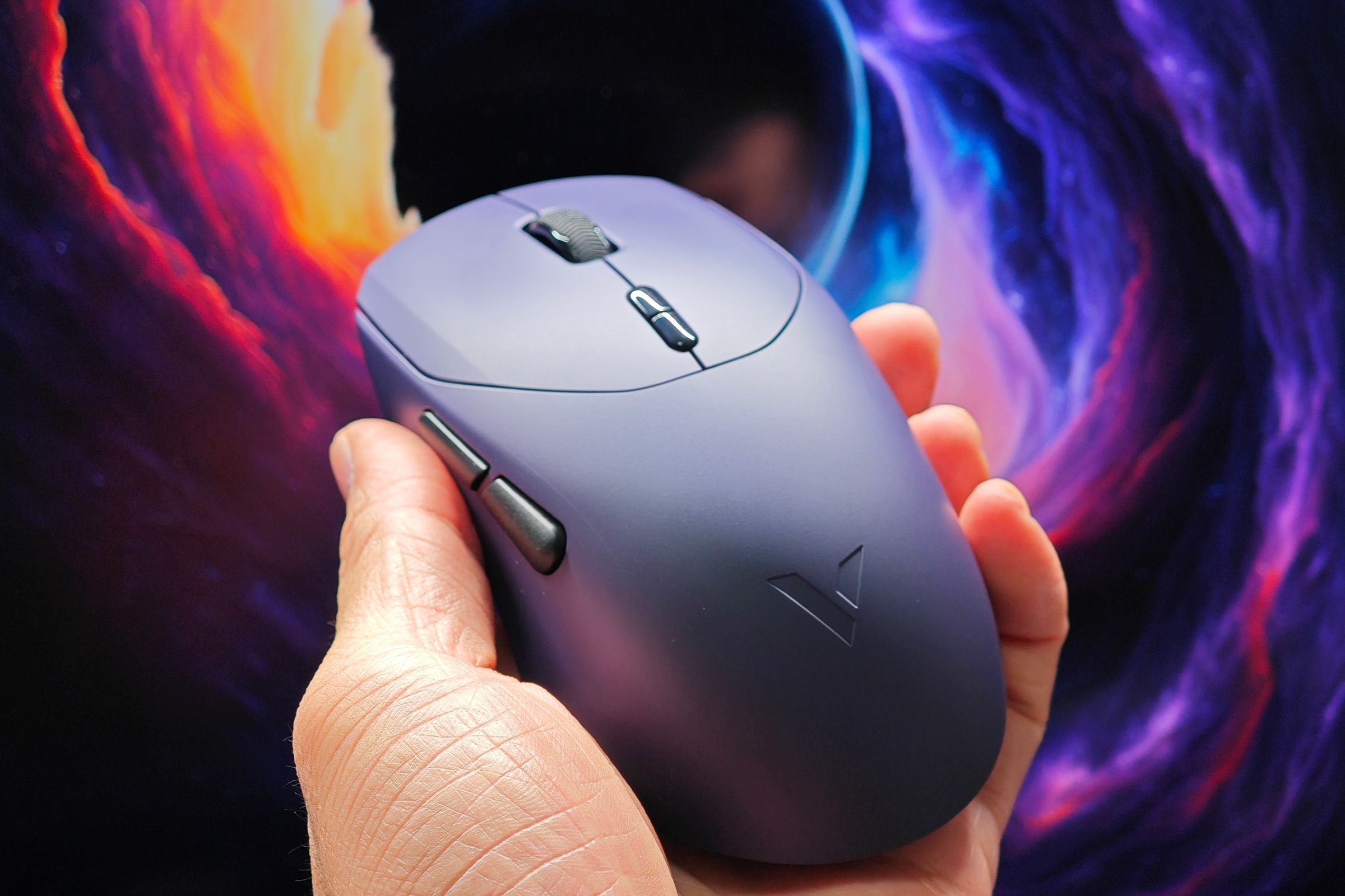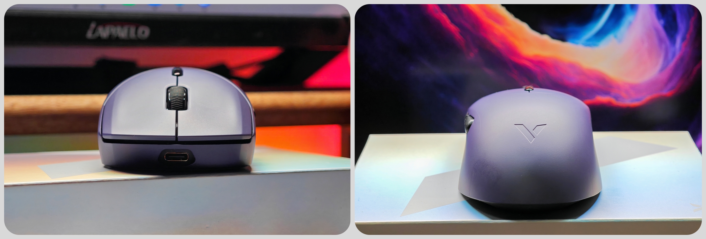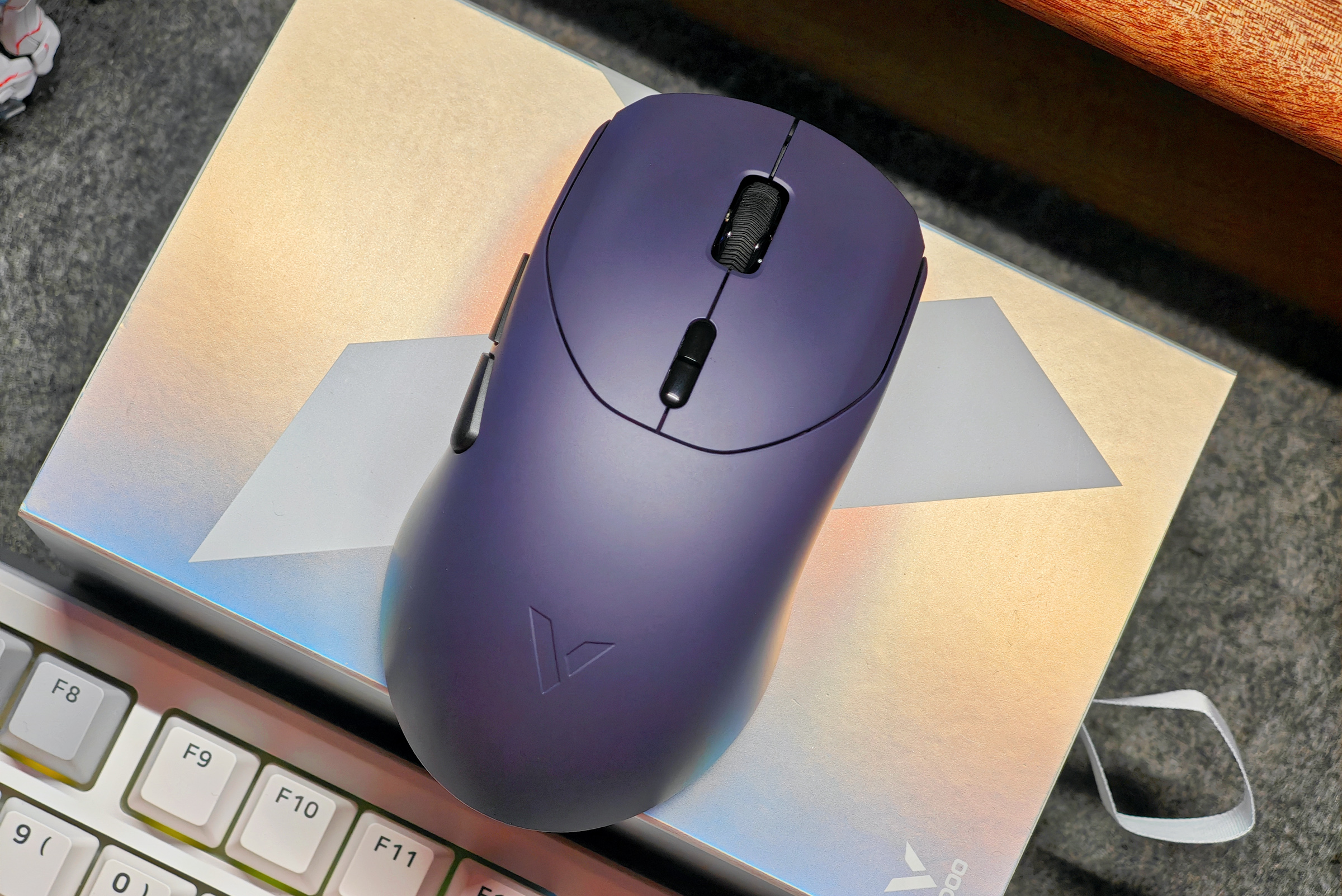▲老婆说“紫色更有韵味”,也不管我信不信,反正她是信了,于是给我安排上了。不得不说,老婆眼光确实毒辣,这款 电驭紫 蛮好看的(此外还有白/黑两个比较常规的颜色)。从上方看,VT9 MAX电竞鼠标采用了 右手对称式设计,整体比较修长,适合我这样的 中大手玩家 。