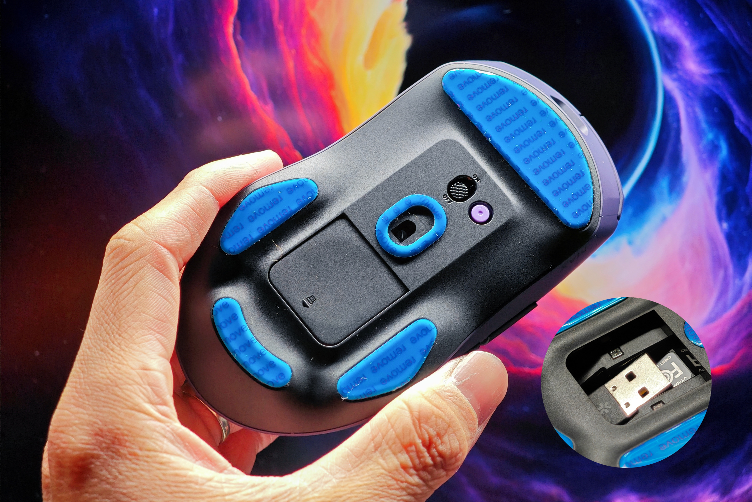 ▲鼠标底部是 电源开关 以及自定义按键 ,最下方是磁吸式接收器收纳仓 。 收纳仓的盖板支持更换为 雷柏外设充电生态产品—— P5充电底座 及 P3无线充电模块 ,让鼠标续航摆脱充电线。