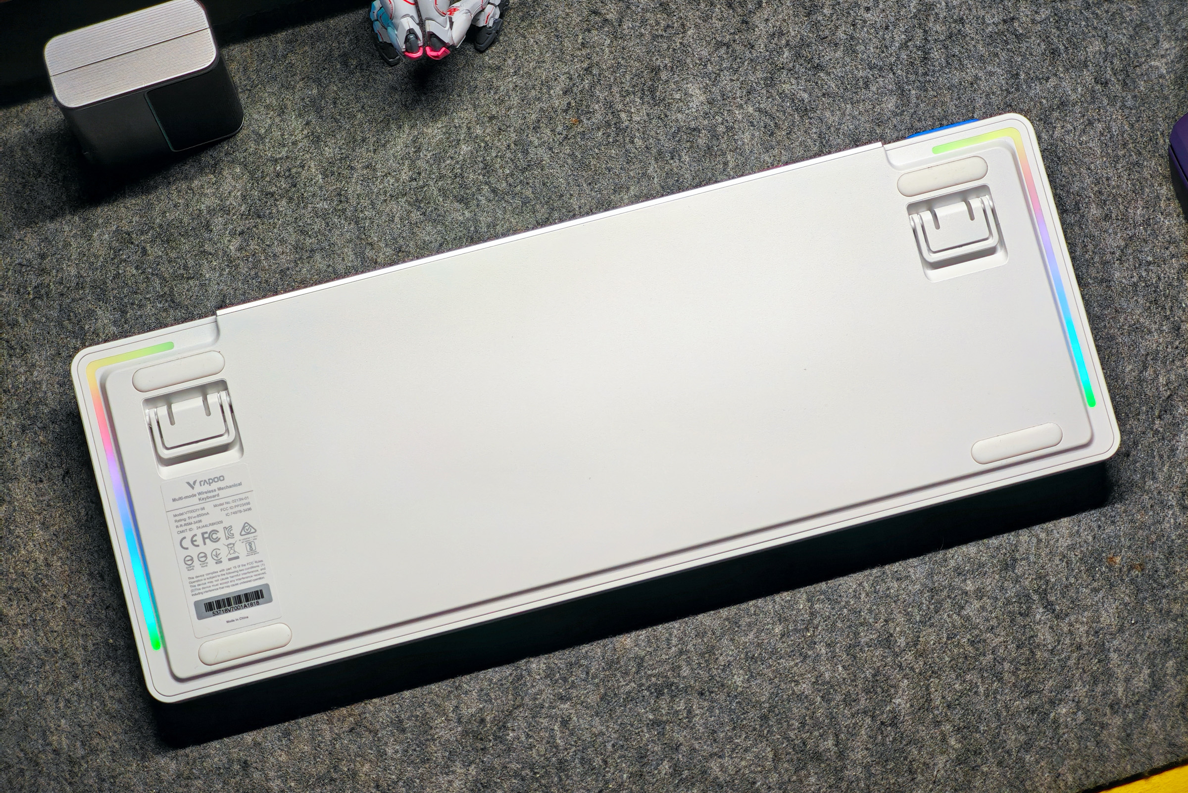 ▲键盘底面配置了四个大面积防滑硅胶垫,两侧还有 炫彩氛围灯带 ,并配置了 二段脚撑 方便玩家自行调节。