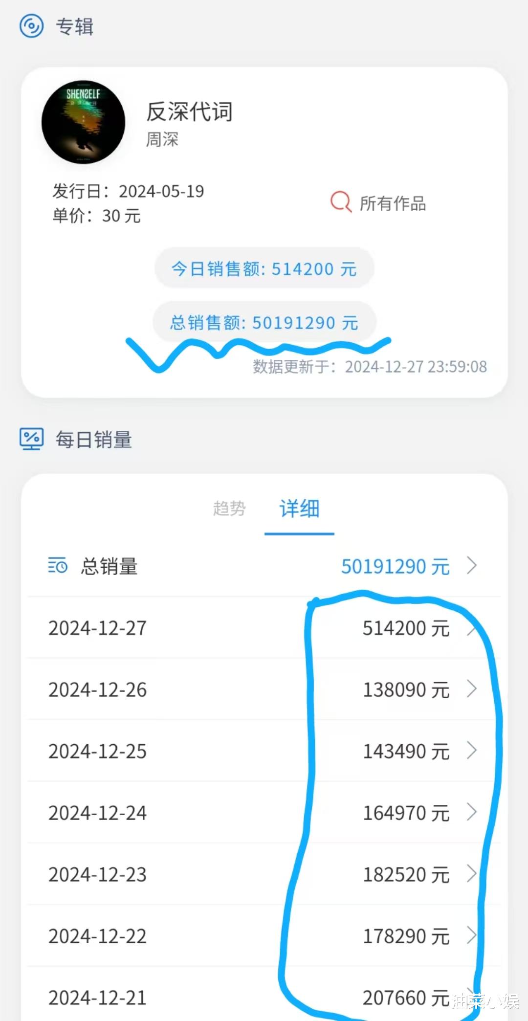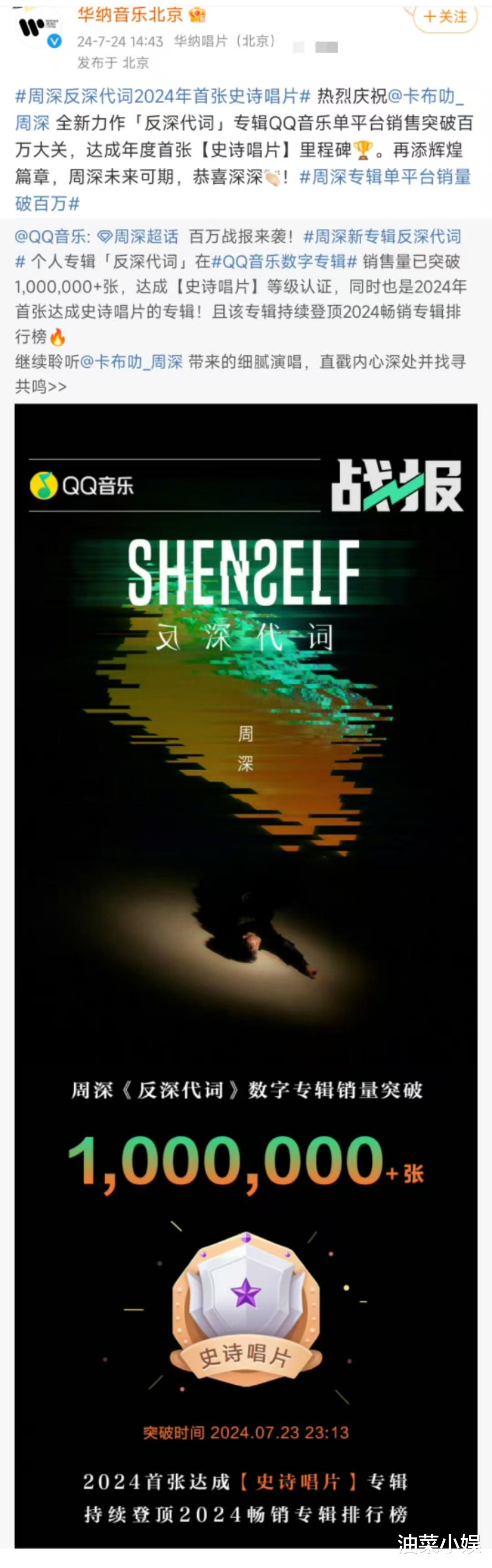 2024年即将步入尾声,回顾2024年的乐坛,不得不说是华语乐坛相对萧条的一年。全年只有一首大爆曲《小美满》,是上至七八十岁的耄耋老人,下至两三岁的懵懂小儿都会唱的幸福旋律,除了《小美满》,今年并没有任何一首热度和传唱度能够与之媲美的歌曲。受影视寒冬影响,2024年也没有像往年一样产生“大爆剧”,唯一热度较高的古装权谋剧《庆余年2》也只有一首片尾曲《借过一下》在剧粉之中小爆,这首歌也是2024年唯一一首破百万收藏的影视音乐。然而,在娱乐行业极为萧条的2024年,却有一张现象级专辑发行,这张5月19日发行的专辑销售额已超过5020万,销量超167万张,是2024年全平台年榜冠军,QQ音乐全年第一张也是唯一一张达成史诗唱片认证的专辑,限购后销售额排名第二,它就是歌手周深的第二张个人专辑《反深代词》。