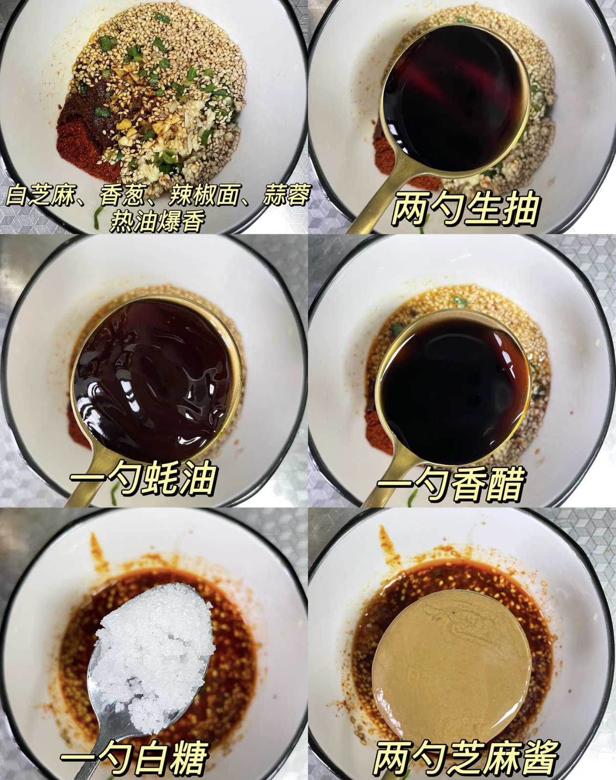 第三步,也是最关键的一步——调酱汁!这碗酱汁就是麻辣拌的灵魂,我把配方精确到了勺,厨房小白也能一次成功。在碗里放入一勺白芝麻、一勺辣椒面、少许葱花和蒜末,然后浇上一勺滚烫的热油,“滋啦”一声,香味瞬间就出来了!接着加入两勺生抽、一勺蚝油、一勺香醋、一勺白糖、两勺芝麻酱,再根据自己的口味加一勺辣椒油,搅拌均匀,这碗万能酱汁就调好了。