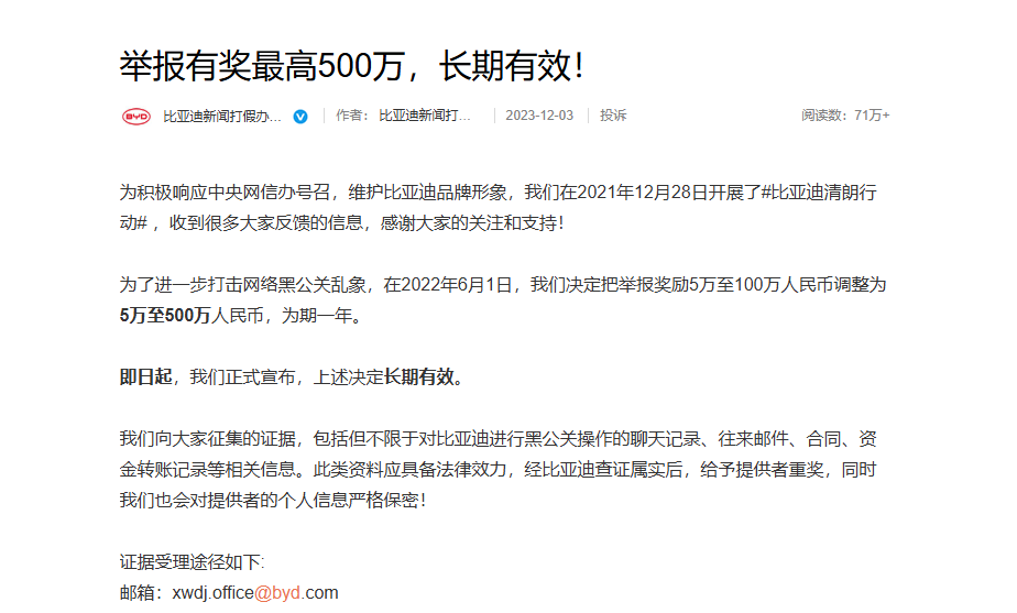 其实早在几年前,比亚迪就设立了最高500万的黑公关证据和线索征集奖金,至今有效。从这就看得出,迪子捍卫品牌正当权益的决心和态度,也是给汽车行业带来了清朗之风。