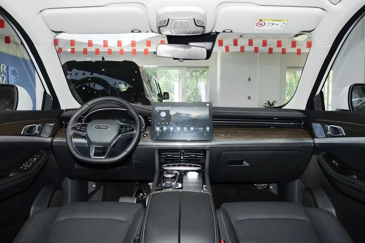 科技感:创维EV6的内饰设计简约大方,中控台搭载了一块大尺寸的液晶触控屏,操作便捷,凸显出前卫科技气息。