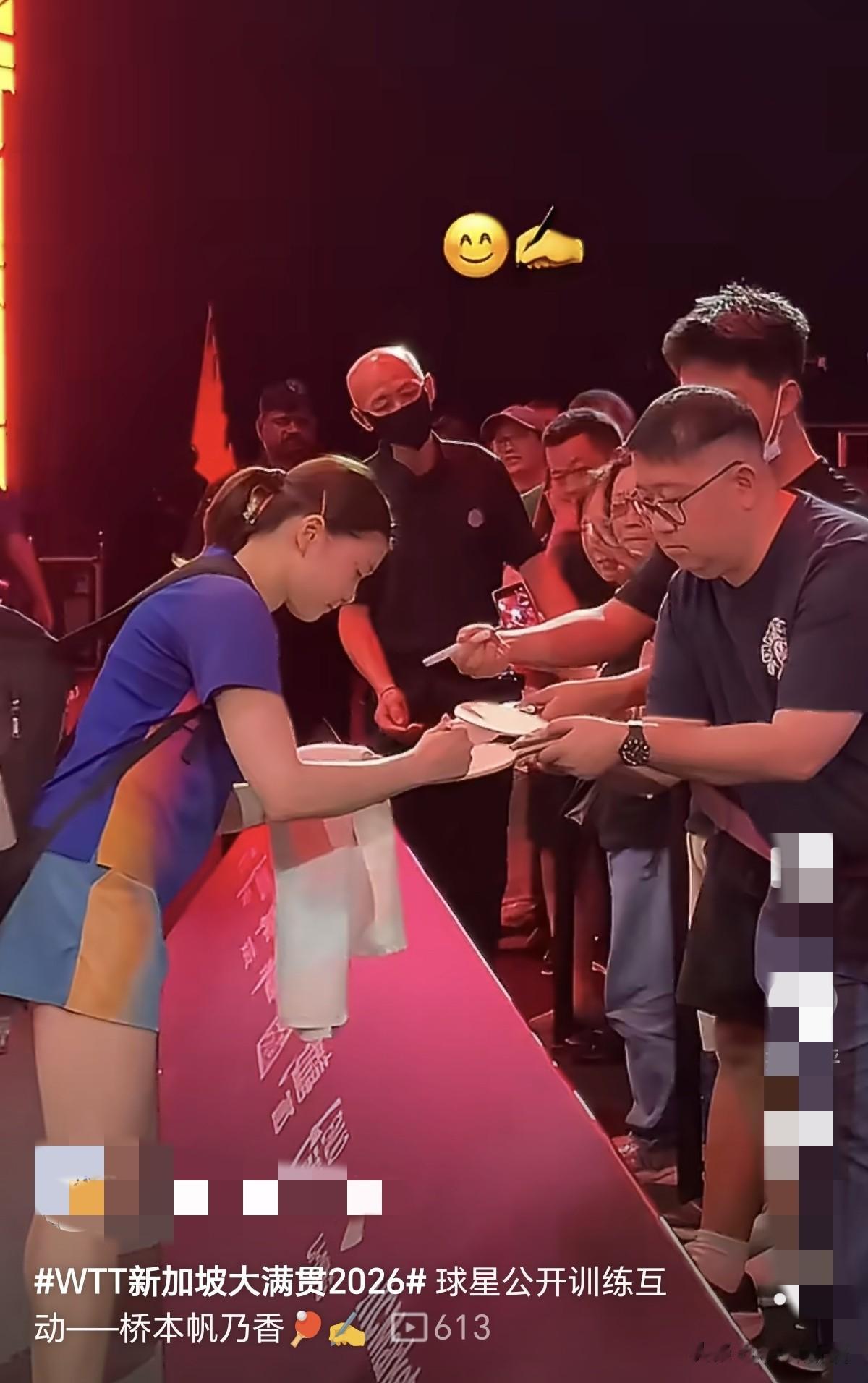 桥本训练结束后,场边有进来看训练的球迷,他们都拿着板让桥本签名了,还没有看到国乒队员们在这个场地训练,如果是他们训练,肯定进来看得人更多吧,这也是近距离和球员们互动了。