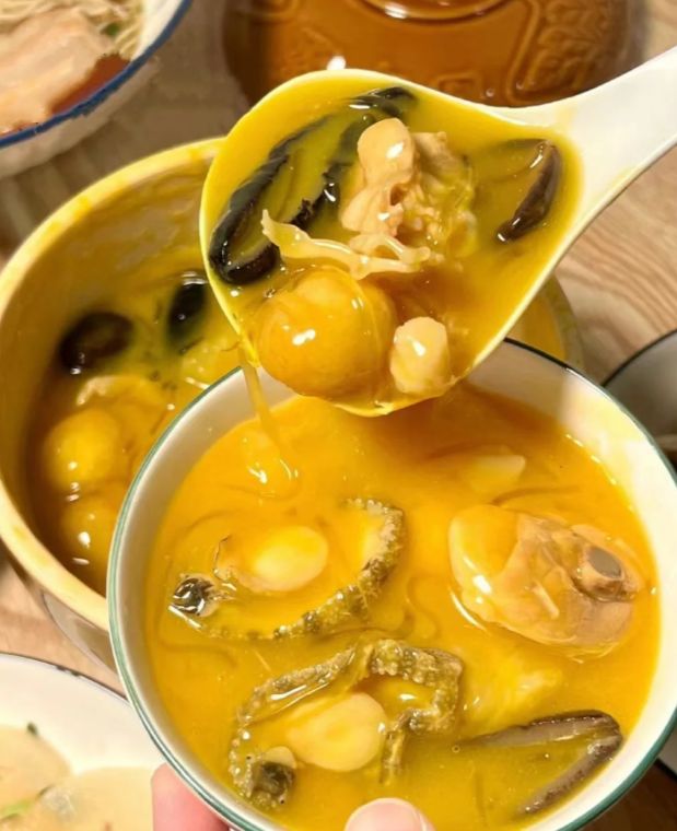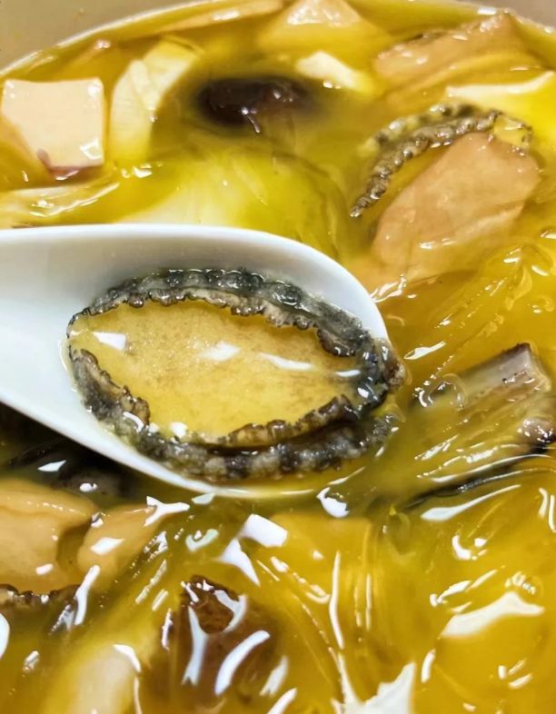 汤浓的技巧。 佛跳墙的浓汤,并非依靠勾芡,而是来自于富含胶原蛋白的食材(如猪蹄、蹄筋、皮胶等)在长时间小火炖煮下的自然释放。通常会加入顶级的金华火腿和老母鸡、猪骨熬制的高汤作为基底。封上坛口,用荷叶或玻璃纸密封,以最小火慢炖四到六个小时以上,让各种食材的鲜味和胶质充分交融、渗透,最终融汇成一坛色泽金黄、浓稠挂唇、味道丰富协调的极品美馔。
