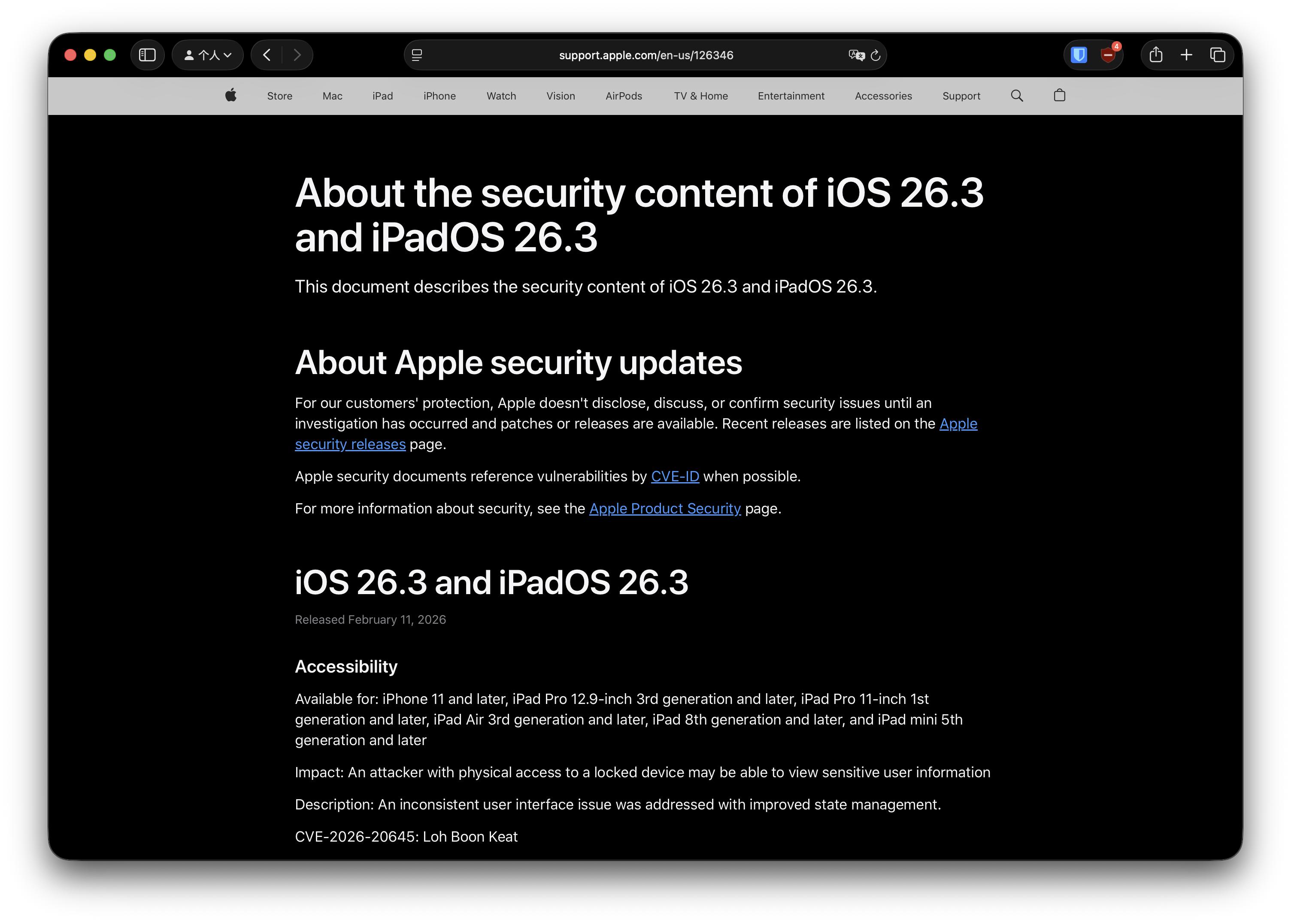 安全性修复尽管可见变化不多,但 iOS 26.3 内部修复了大量安全漏洞。根据苹果官方文档,本次 iOS / iPadOS 26.3 共修复多达 37 项安全问题。