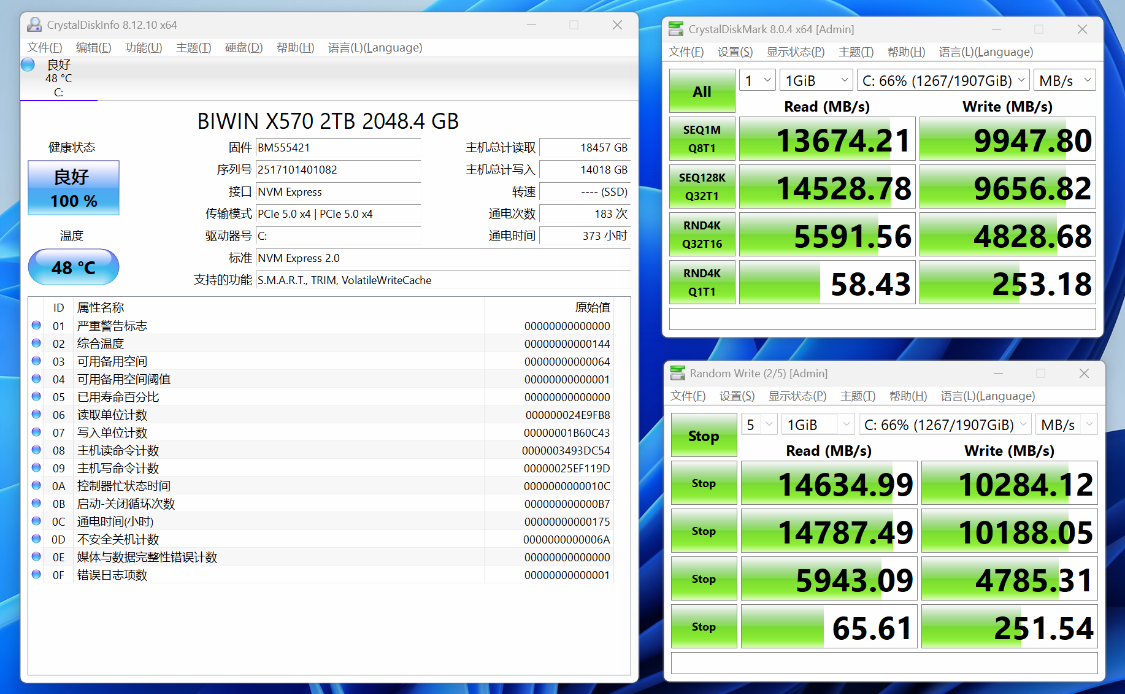 CrystalDiskMark硬盘读写测试,X570硬盘连续读取速度为14634.99MB/s,连续写入速度为10284.12MB/s,而硬盘在测试过程中的温度全程保持在50°以内;