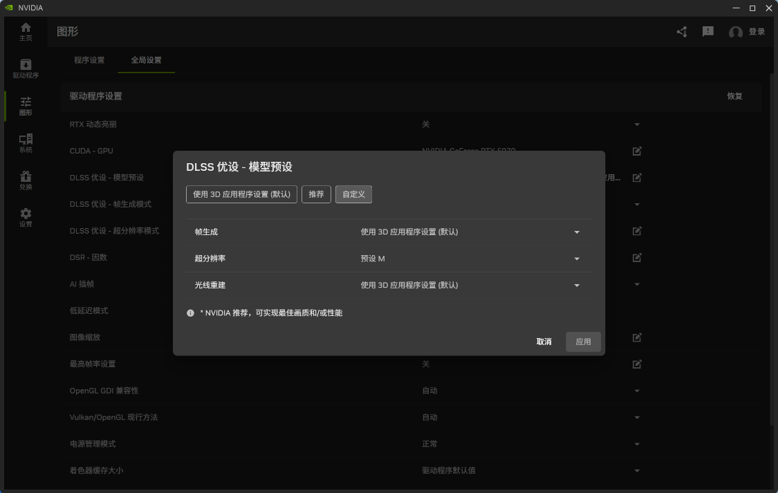 在NVIDIA APP中,图形设置中,将全局设置中的DLSS模型预设改为:预设M。再次进入游戏,在同样的画面设置下,在龟背场景中,开启“DLSS 4.5”,超采样清晰度设为50后,游戏帧数为380FPS左右,关闭DLSS,并将超采样清晰度设为100,游戏帧数为105FPS左右。