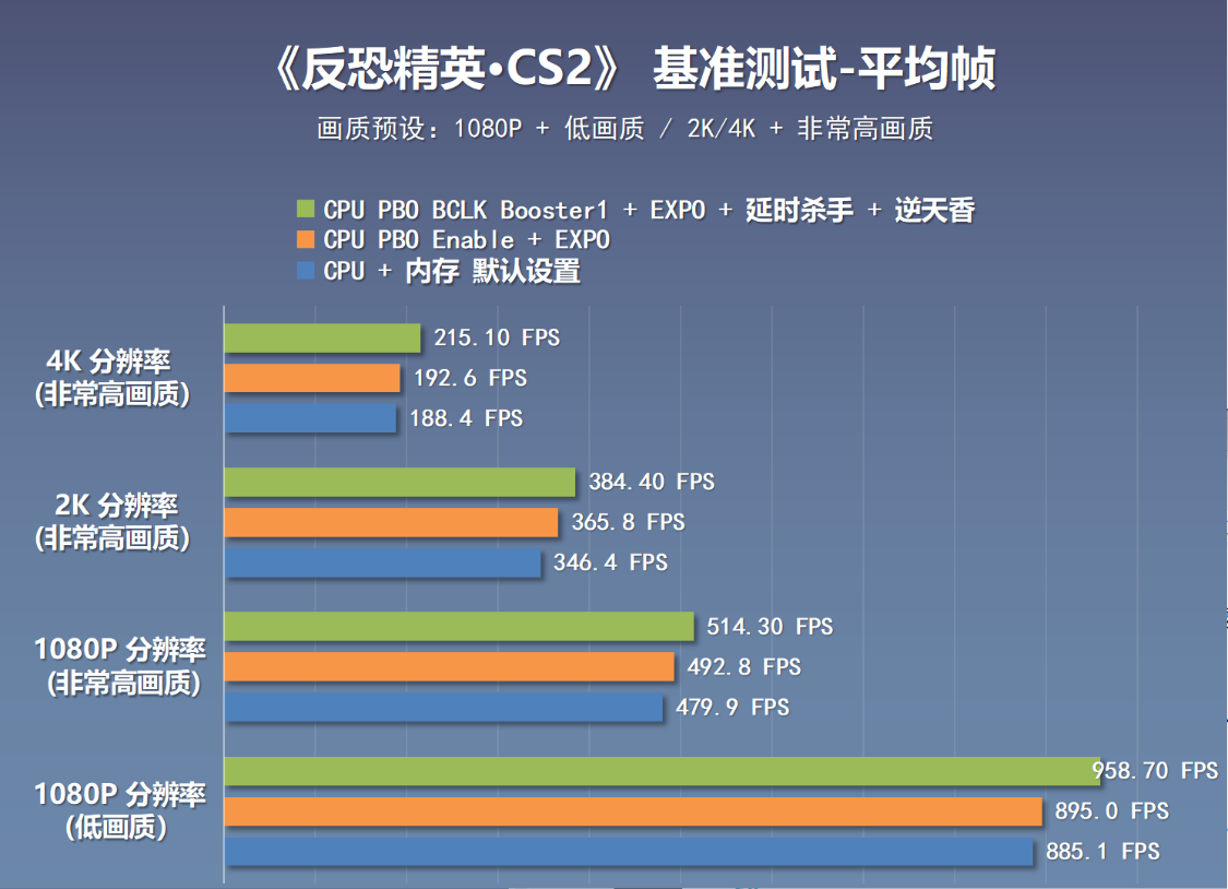 《CS2》基准测试,在CPU和内存不同状态下,分别在4K分辨率+非常高画质、1080P+非常高画质以及1080P+低画质下进行测试,游戏帧数表现如下: